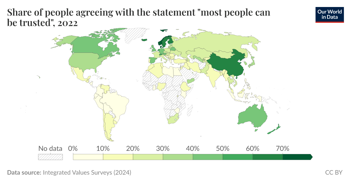 Pretty clear trend: low-trust societies have low gdp and high-trust societies have high gdp, regardless of resource distribution. Africa/South America are resource rich, japan/iceland are resource poor.